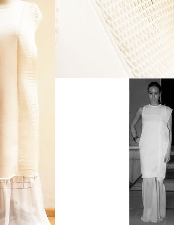 The materials used are neoprene, power mesh and wool felt hand inserted into the mesh to create new spaces and textures in the garment.